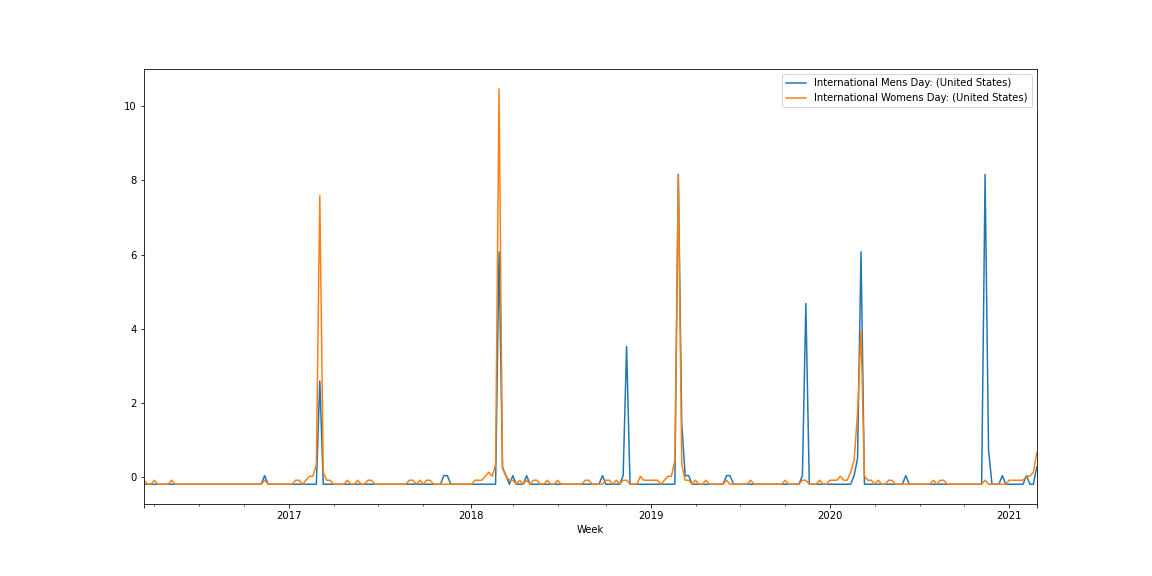 Depending on resolution, the timing may still be a bit difficult to work out (the source allows for interaction to confirm dates). The peaks at the start of the year (slightly to the right of each major year tick) coincide with International Women’s Day (March 8), and the peaks later in the year coincide with International Men’s Day (November 19). There are little bumps that don’t lend themselves to intuitive explanations, but these results are telling. International Men’s Day (the blue line) commonly has two peaks each year, one in March, and one in November. Last year (March/November 2020) was the first year that searches for International Men’s Day were were more popular on the actual holiday than on International Women’s Day. Interestingly, the peaks in November are much higher after 2018, which was the first year in which Richard Herring started his charity drives. It does seem clear though that the “y no mens day?” group isn’t just a vocal subset on social media, but that a meaningful number of people are responding to International Women’s Day by searching for International Men’s Day.
